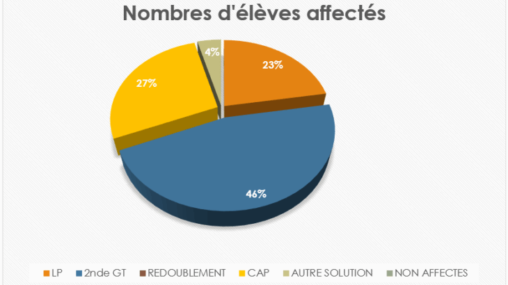 Nombres d’élèves affectés Pourcentage Seconde Générale 56 46 % CAP 33 27 % Lycée Professionnel 27 23 % Autre Solution 5 4 % Redoublement 0 0 %